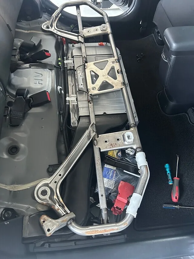 周囲の内装や補強フレームを慎重に取り外して、バッテリーユニットを取り出します。