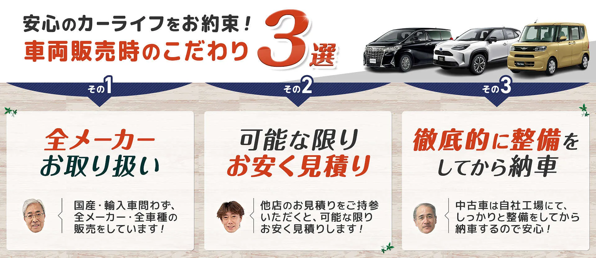 軽自動車やワンボックス、コンパクトカーなど、ご要望やご予算をヒアリングさせていただいた上で、プロが最適な車種をご提案。
